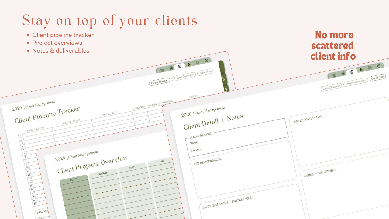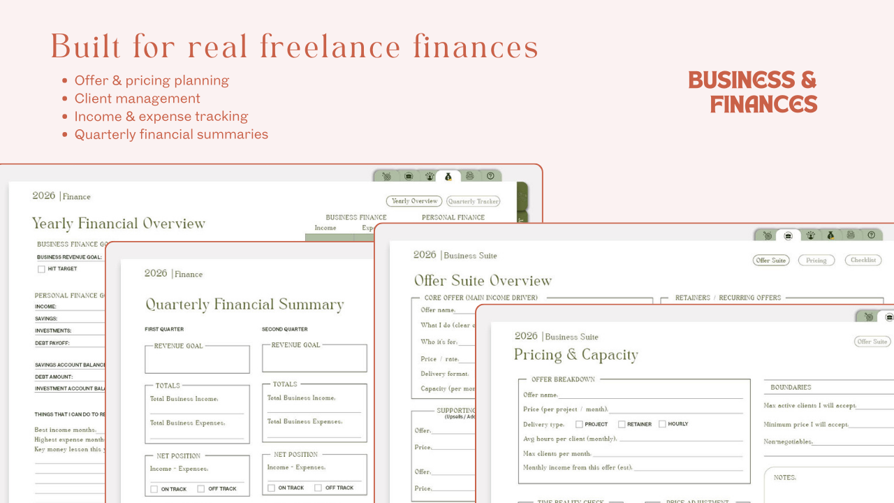 - Business first pages for offers, clients, pricing, and finances