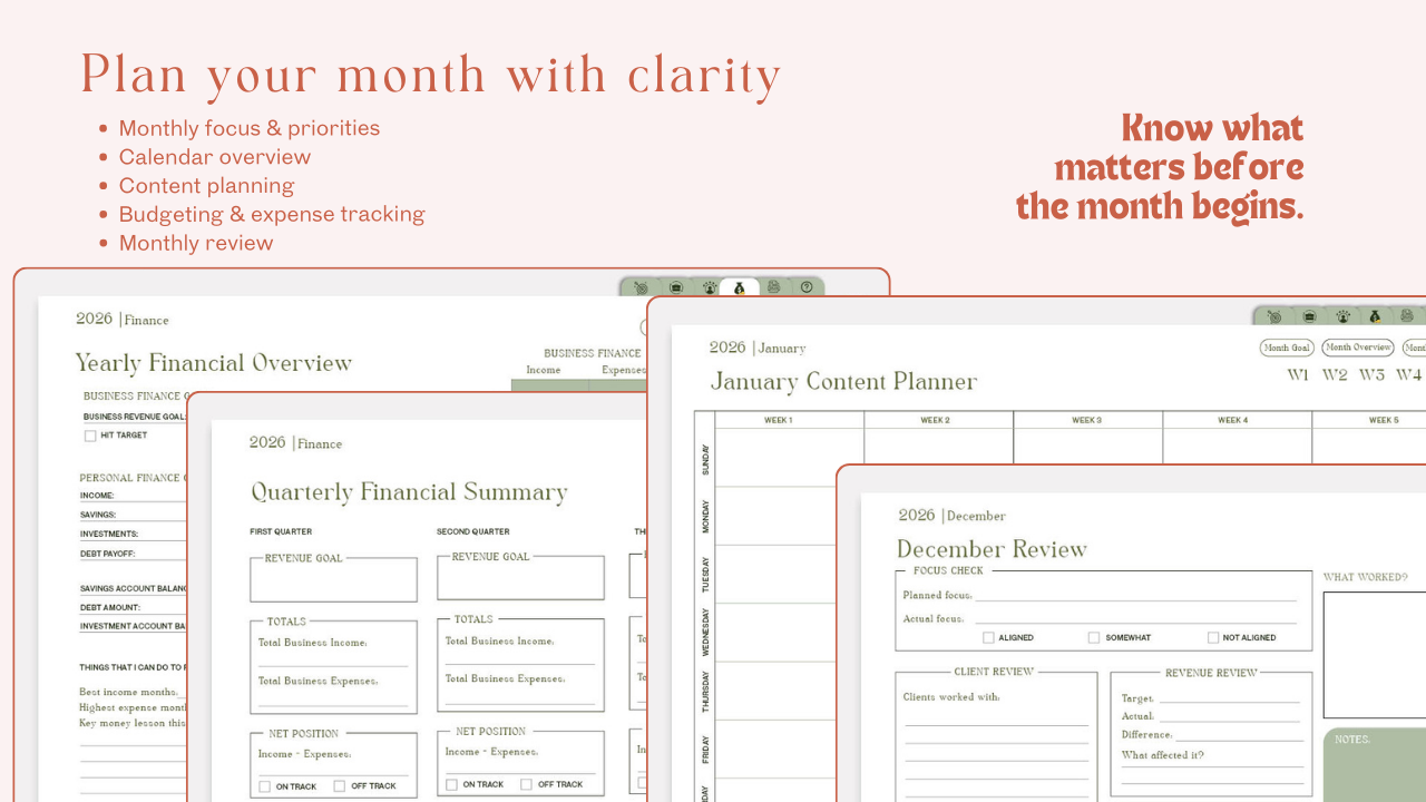 - Monthly and quarterly reviews that actually connect to your goals